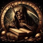 A cloaked figure with a skull mask studies an ancient book by candlelight, surrounded by mystical shadows and an ornate clock, evoking an eerie, supernatural atmosphere.