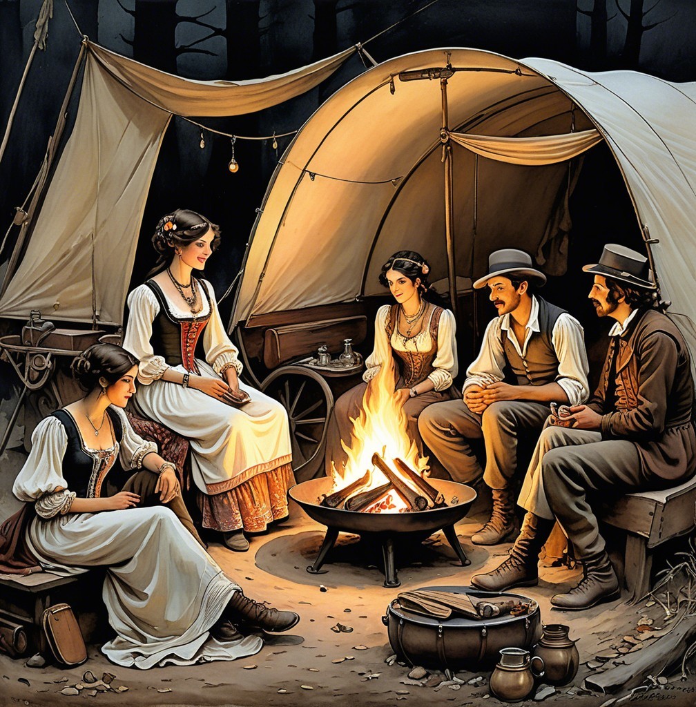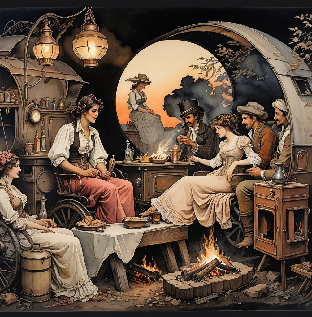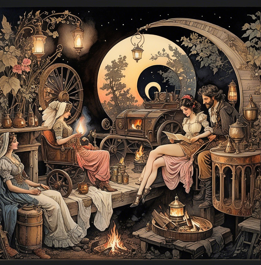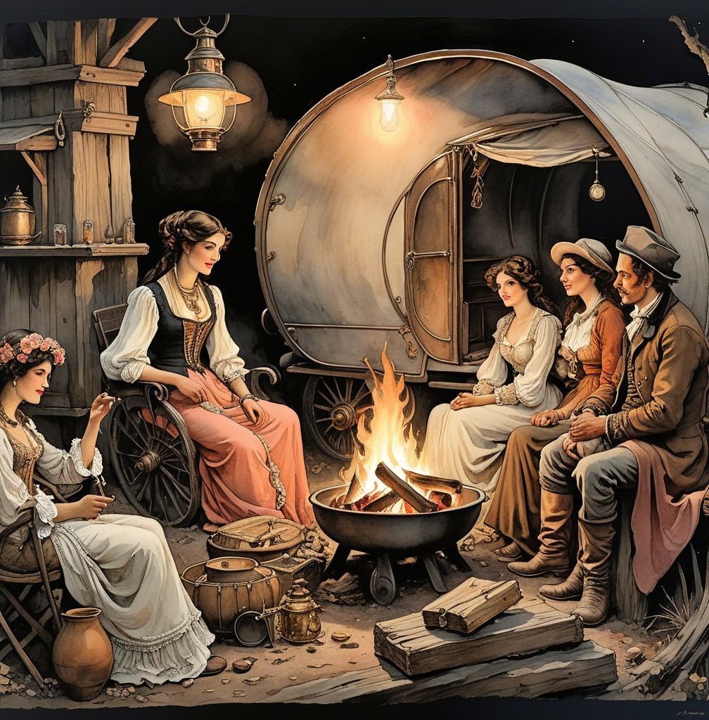 . Gypsy revelry around the camp fire, caravan, colored ink drawing, watercolor artwork on old withered paper, vintage, by Caravaggio, Fragonard, Anton Pieck, pale colors, high detail, intricately detailed, hyperdetailed volumetric lighting, art nouveau graphic steampunk ., whimsical, beautiful, poignant, touching. colors blush bronze, black. soft watercolor extra water in magical realism by Annigoni, Egon Schiele, Milo Manara, Botticelli, Catrin Welz-Stein, Jean Metzinger, Klimt, perfect eyes, perfect handsface, highly detailed, complementary colors, hyper detailed. Watercolor and ink splatter, dynamic pose, dark blue background, unreal engine, alphonse mucha, global illumination, detailed and intricate environment Beautiful woman in the style of Pino Daeni Dorota Piotrowiak Edward Gorey, junji ito, klimnt , gold leaf color, silver leaf color beautiful dynamic lighting high definition hdr * Random prompt award winning Max Ernst ultra detailed 4K 3D Texture