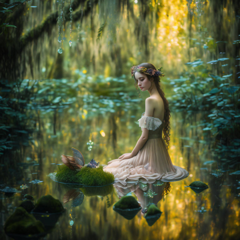 Far-shot, 32k best quality professional photograph, DOF, Swamp, pre-Raphaelite colors, dreamlike, surreal atmosphere, ethereal lighting, water ripples. Renaissance infused: A Young rococo Woman with a cute Girl Fae, sitting in water, reflective, Leonardo da Vincis reflective nature, chiaroscuro. Mystical sorcery, surrealism; moonlit forest, surreality of Ren Magrittes dreamscapes. distorted trees, surreal shadow creatures, nightmarish imaginings of H.R. Giger, dark and mysterious, enchanting scene, professional ominous concept art, by artgerm, greg rutkowski, intricate, elegant, highly detailed digital painting, concept art, smooth, sharp focus, illustration, style of simon stalenhag, wayne barlowe, igor kieryluk, sharp focus, emitting diodes, smoke, sparks, by pascal blanche rutkowski repin, artstation, hyperrealism painting concept art of detailed character design matte painting, blade runner, Broken Glass effect, no background, stunning, mythical being, energy, molecular, textures, iridescent and luminescent scales, breathtaking beauty, pure perfection, divine presence, unforgettable, impressive, Volumetric light, auras, rays, vivid colors reflects, Bokeh: +3