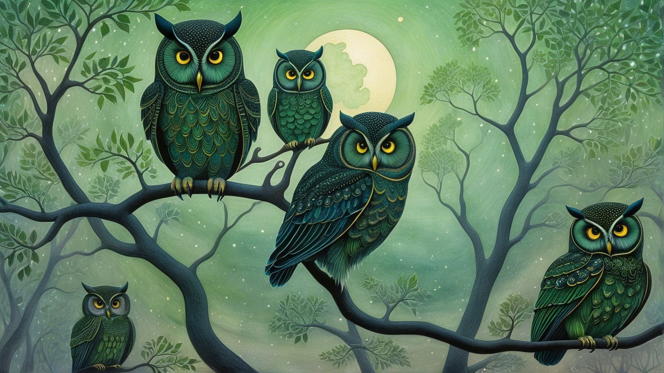 A colorful, artistic depiction of four owls perched on a branch against a vibrant green background, with a glowing moon and leafy trees creating a mystical nighttime atmosphere.