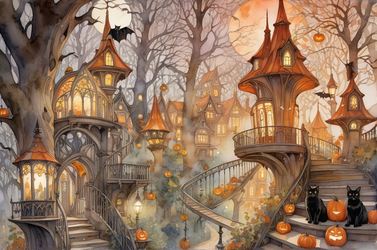 + Prompt:watercolor painting of a village of ornately carved Art Nouveau, Jugendstil, style tree houses, with gothic-style crystal stained glass windows, halloween pumpkins, jack 'o lanterns, witch on a broom, scare-crow, bats, black cats in witches hats, winding spiralling staircases, strings of lights, footbridge, footpath, soft moonlight, mist, elven atmosphere, restful, peaceful, misty waterfall, Arthur Rackham, John Atkinson Grimshaw, Louis Haghe, Monet