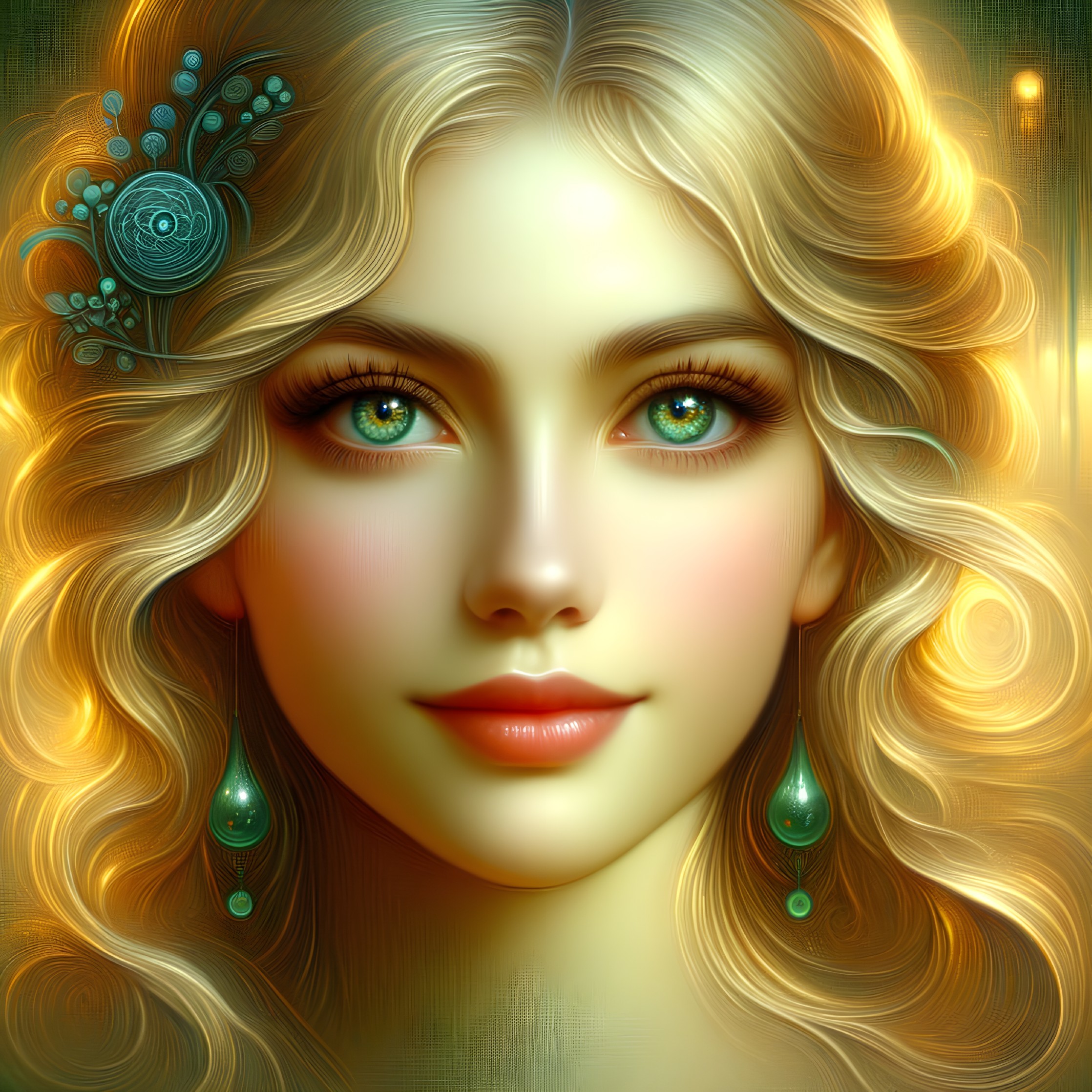 A captivating portrait of a young woman with flowing, golden hair and striking green eyes. She wears elegant earrings and a floral accent, exuding a soft, ethereal glow.