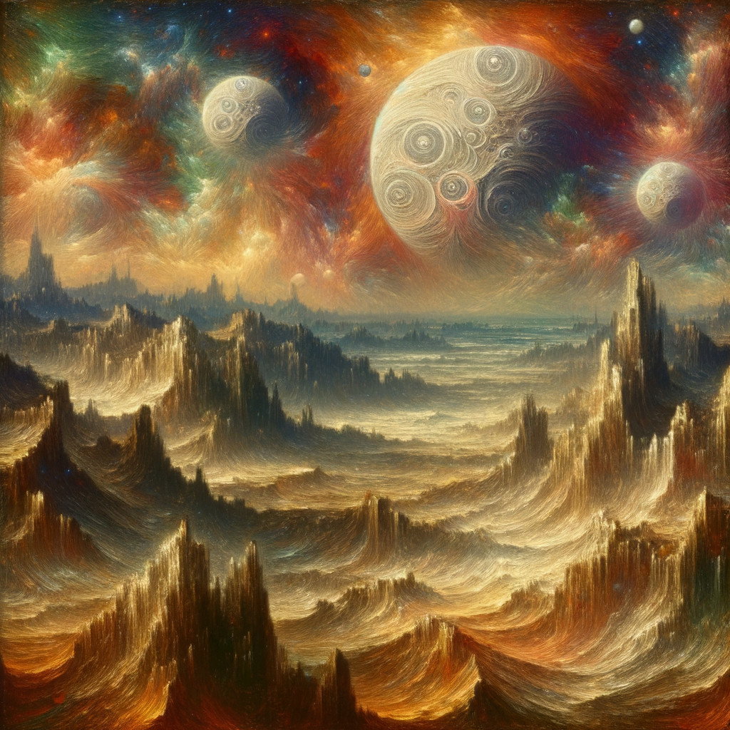 A surreal cosmic landscape with towering rock formations and valleys, illuminated by multiple planets in a fiery sky. The scene evokes otherworldly beauty and vastness, blending imagination and wonder.