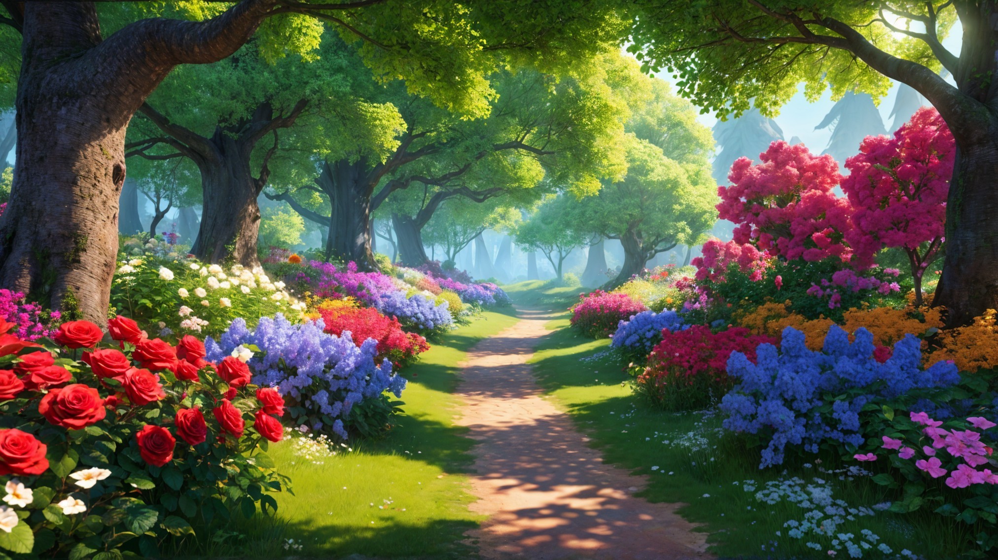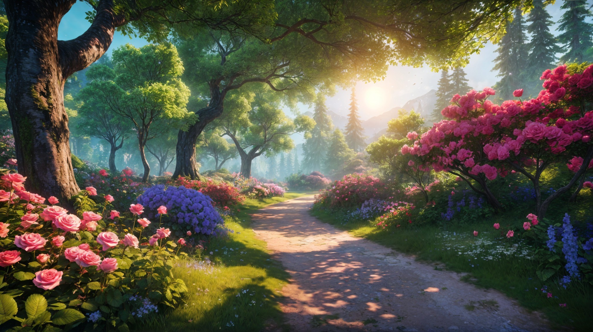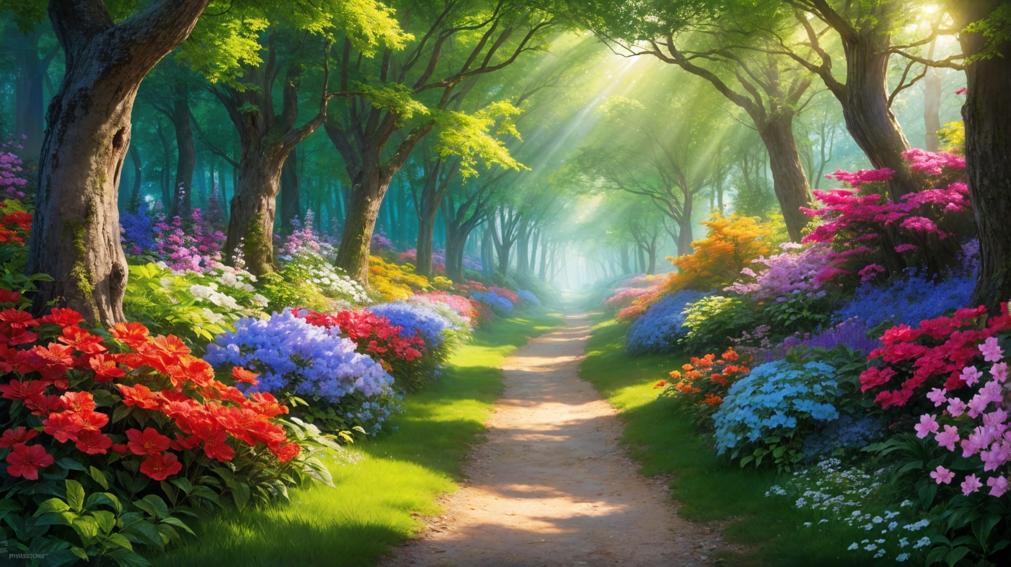 A serene forest path winds through vibrant gardens filled with colorful flowers and lush greenery, illuminated by soft, golden sunlight filtering through the trees.