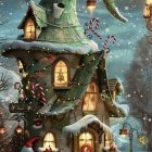 A whimsical, snow-covered cottage sits amidst a winter wonderland. Its rounded architecture features glowing windows, surrounded by frosty trees and soft, colorful clouds in the serene sky.