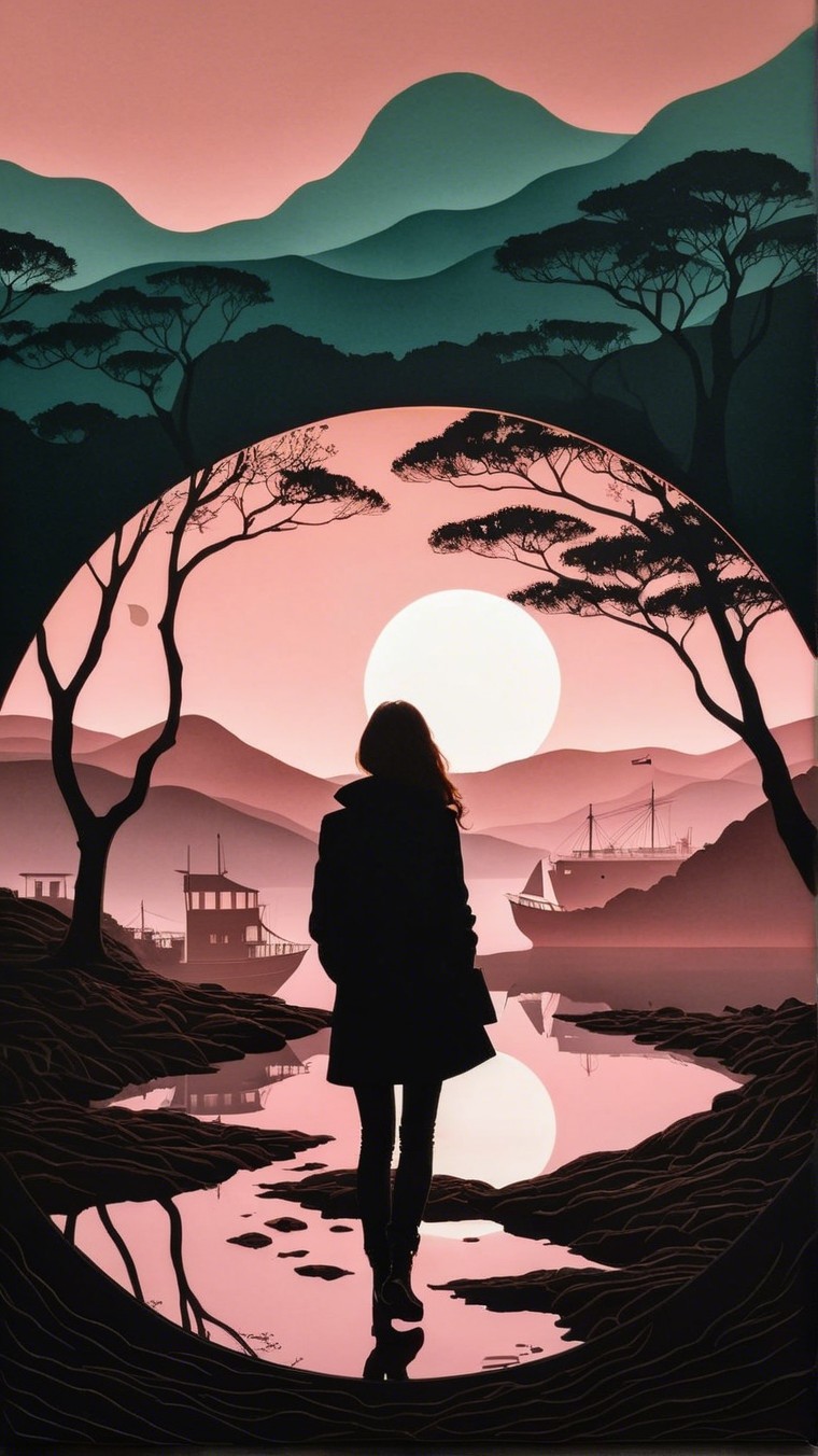 A silhouette of a girl stands before a serene landscape, framed by trees and mountains. Sailing ships glide on a reflective river, while the sun sets, casting a warm, dreamlike glow.