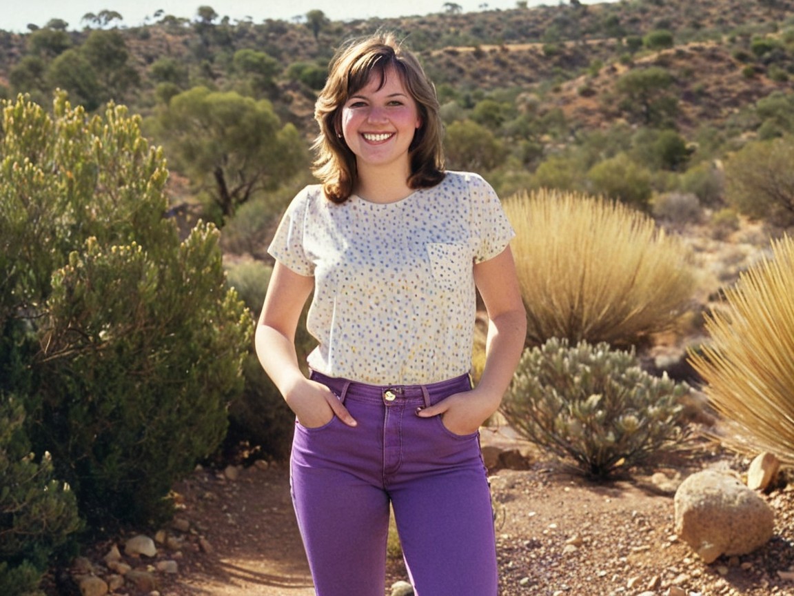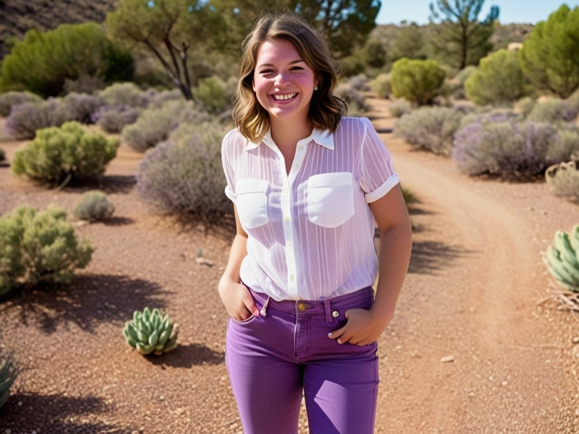 The image features a smiling young woman in a sheer white shirt and lavender trousers, walking along a sandy path surrounded by trees in a desert landscape. Sunlight enhances the cheerful atmosphere.