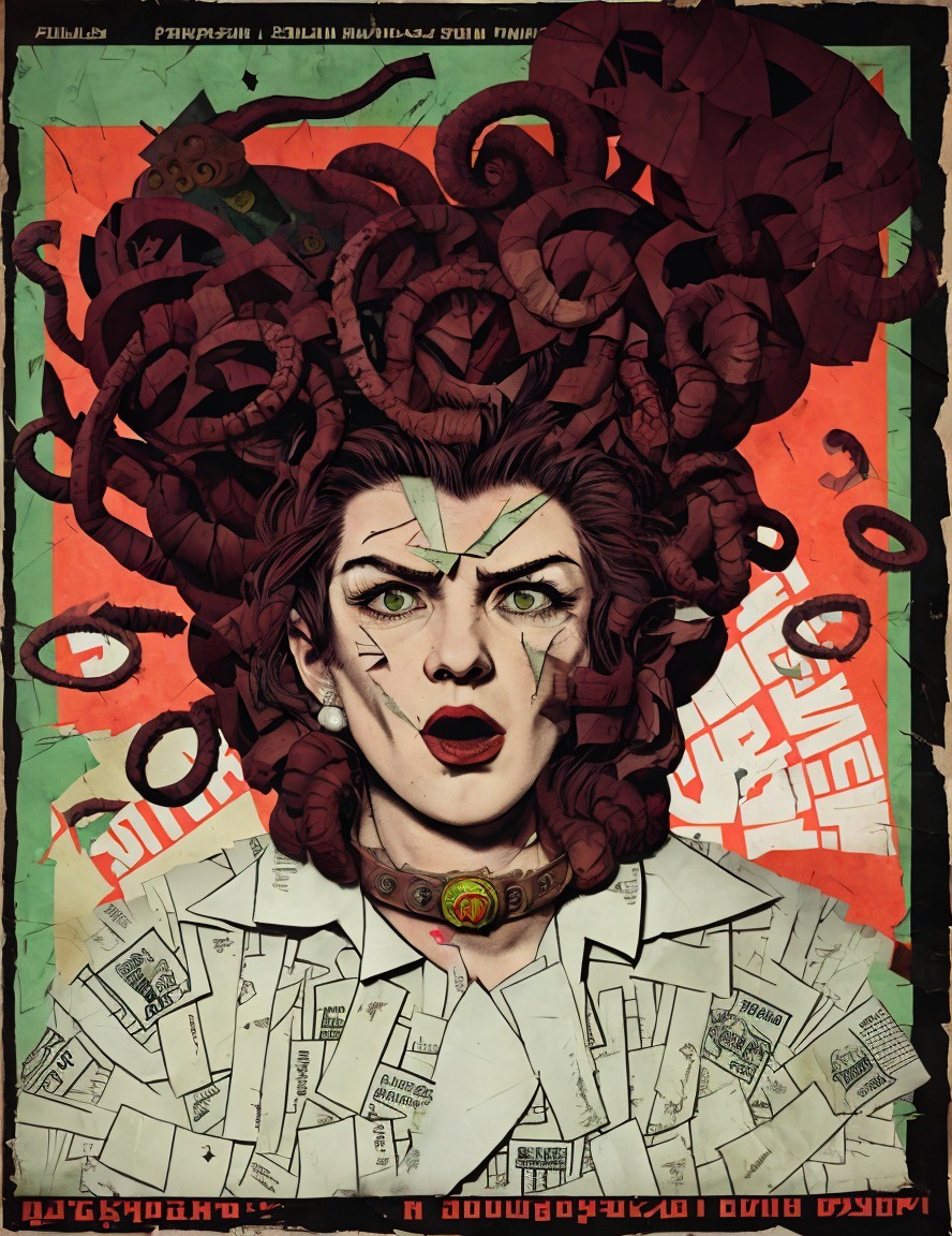 Prompt: An agitprop, Soviet poster style butch lesbian Medusa. She is an older woman wearing glasses and dungarees. Torn paper collage, with punk zine feminist aesthetics.