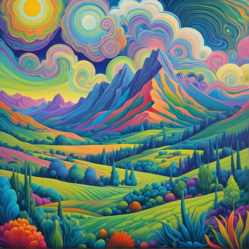 A vivid landscape featuring colorful mountains and rolling hills, with swirling clouds and vibrant trees. The enchanting scene showcases a playful blend of bright colors and whimsical shapes.