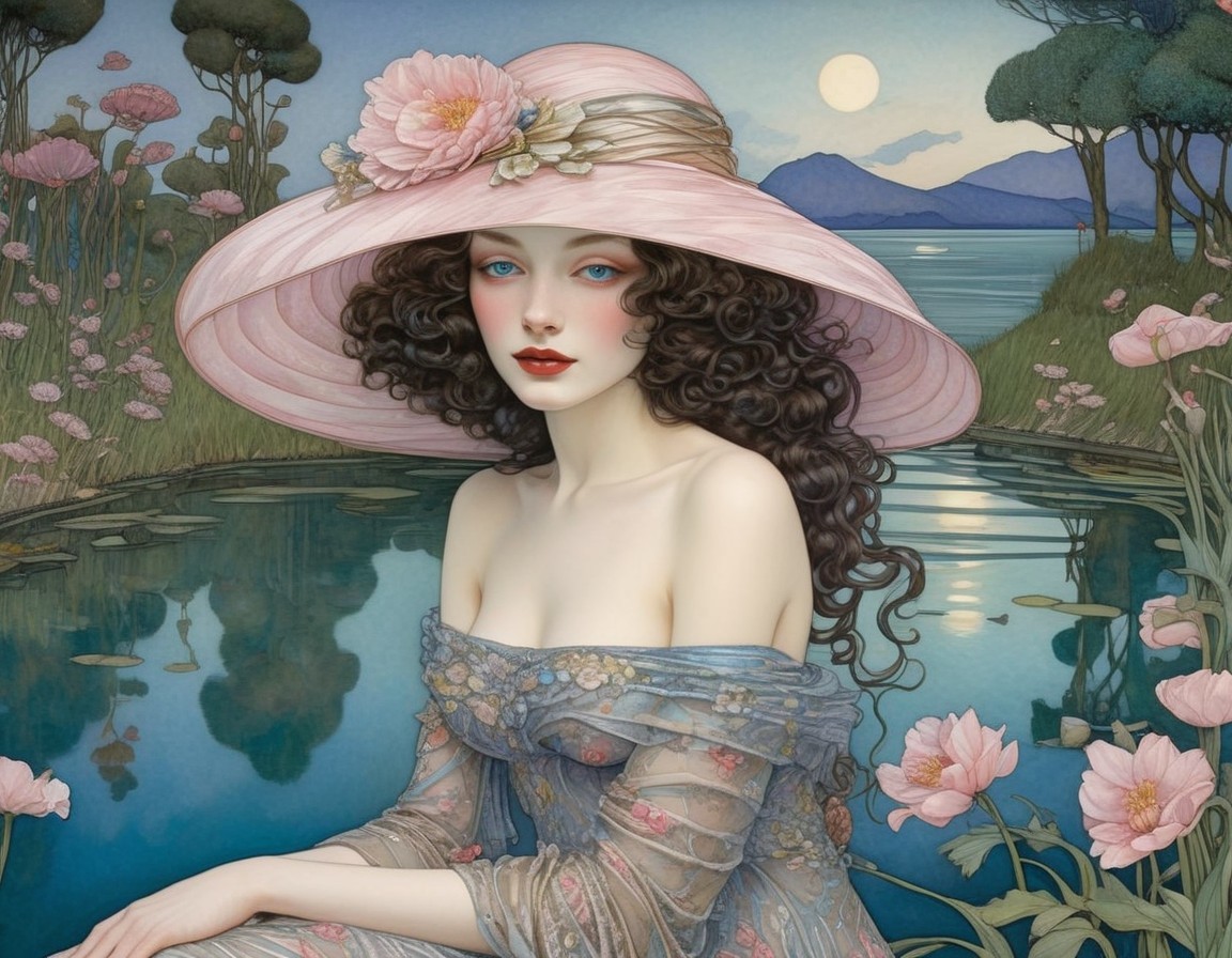 Prompt: Iridescent gown. portrait of a Beautiful sensual woman in elegant floral dress in Art Deco by Annigoni, Egon Schiele, Milo Manara, Botticelli, Catrin Welz-Stein, Jean Metzinger, Klimt, Landscape at night, iridescent sky, without houses, golden ratio, fake detail, trending pixiv fanbox, acrylic palette knife, style of makoto shinkai studio ghibli genshin impact james gilleard greg rutkowski chiho aoshima Tamara de Lempicka Georgia O'Keeffe