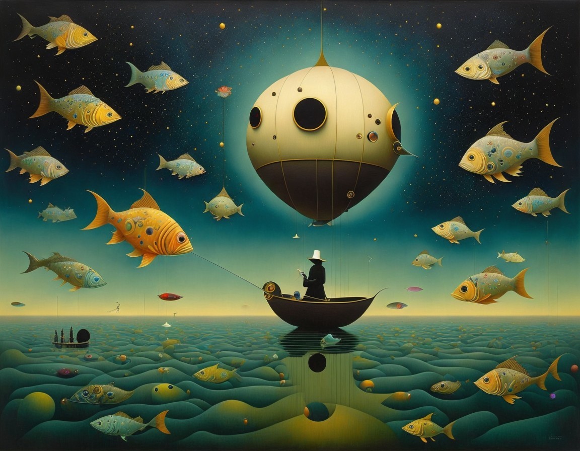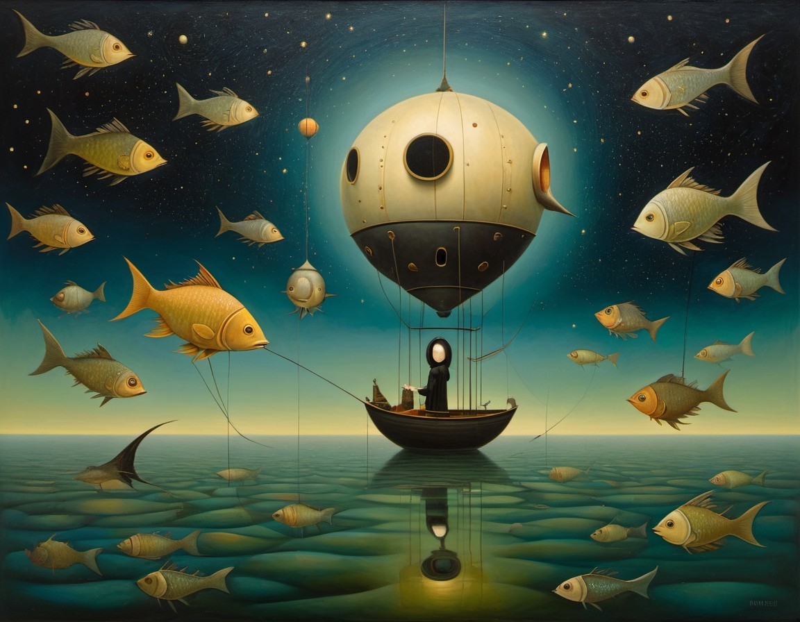 Prompt: "Fishing for Dark Matter in the Universe. Surreal in the style of Hieronymous Bosch, Naoto Hattori. . Minimilist, surrealism of Roberto Matta."