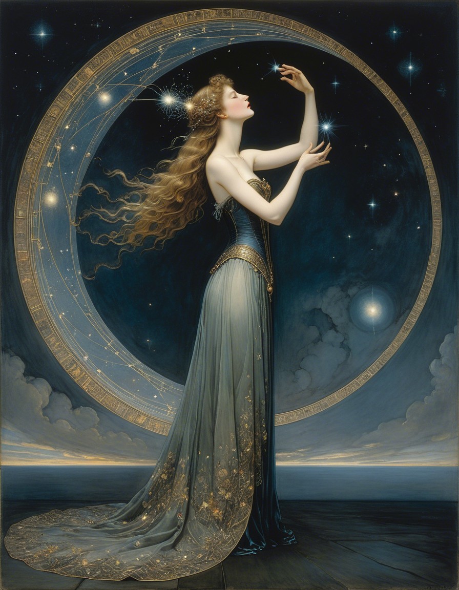 A graceful woman stands against a starry night, adorned in a flowing gown with celestial motifs. She holds a delicate star, embodying beauty and harmony with the cosmos.