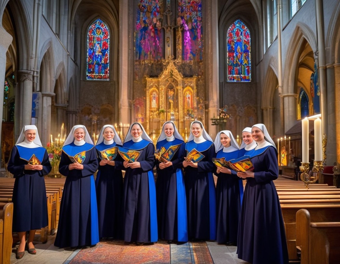 Four women dressed in blue and white uniforms stand in a church, with stained glass windows and other figures in the background.