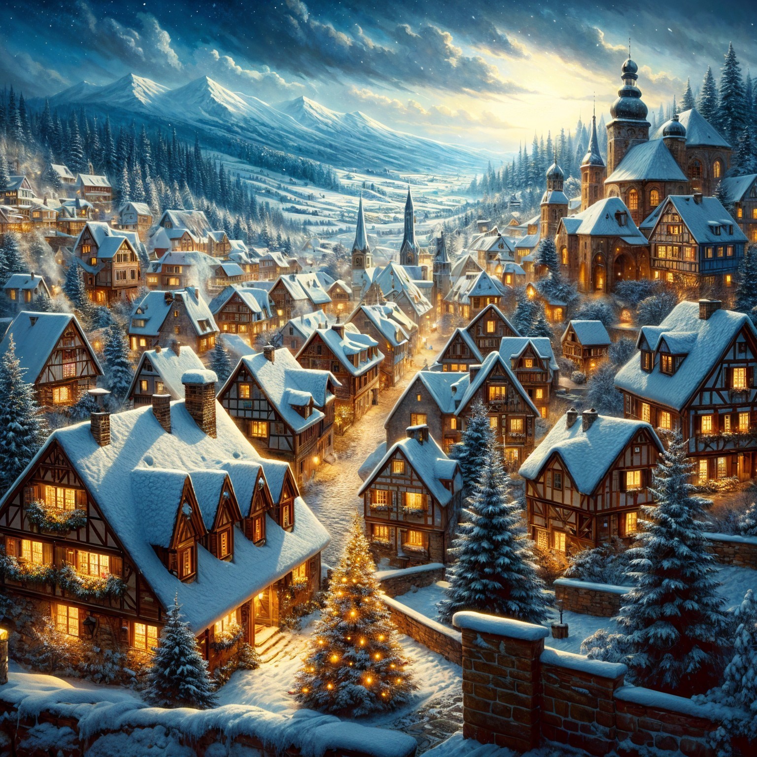 An intricately detailed, cinematic photograph of a snow-laden fantasy Christmas village nestled in a valley, bathed in the soft glow of twilight and the warm light emanating from the windows of charming, wood-beamed houses with steeply pitched, snow-covered roofs and multiple dormer windows, adorned with wreaths and