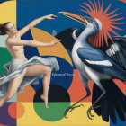 Dancer and Colorful Bird in Abstract Geometric Scene