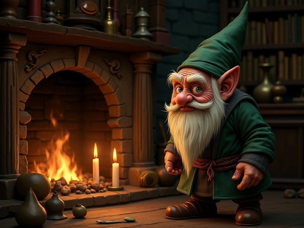 A whimsical gnome stands in a cozy, candlelit room filled with books. His green attire and long beard add charm, while another gnome peeks from behind a shelf, enhancing the enchanting atmosphere.