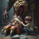 In a dimly lit room, a goblin looms over two children, one on the floor, the other reaching out. The scene is filled with an air of magic and curiosity, surrounded by ancient books and trinkets.