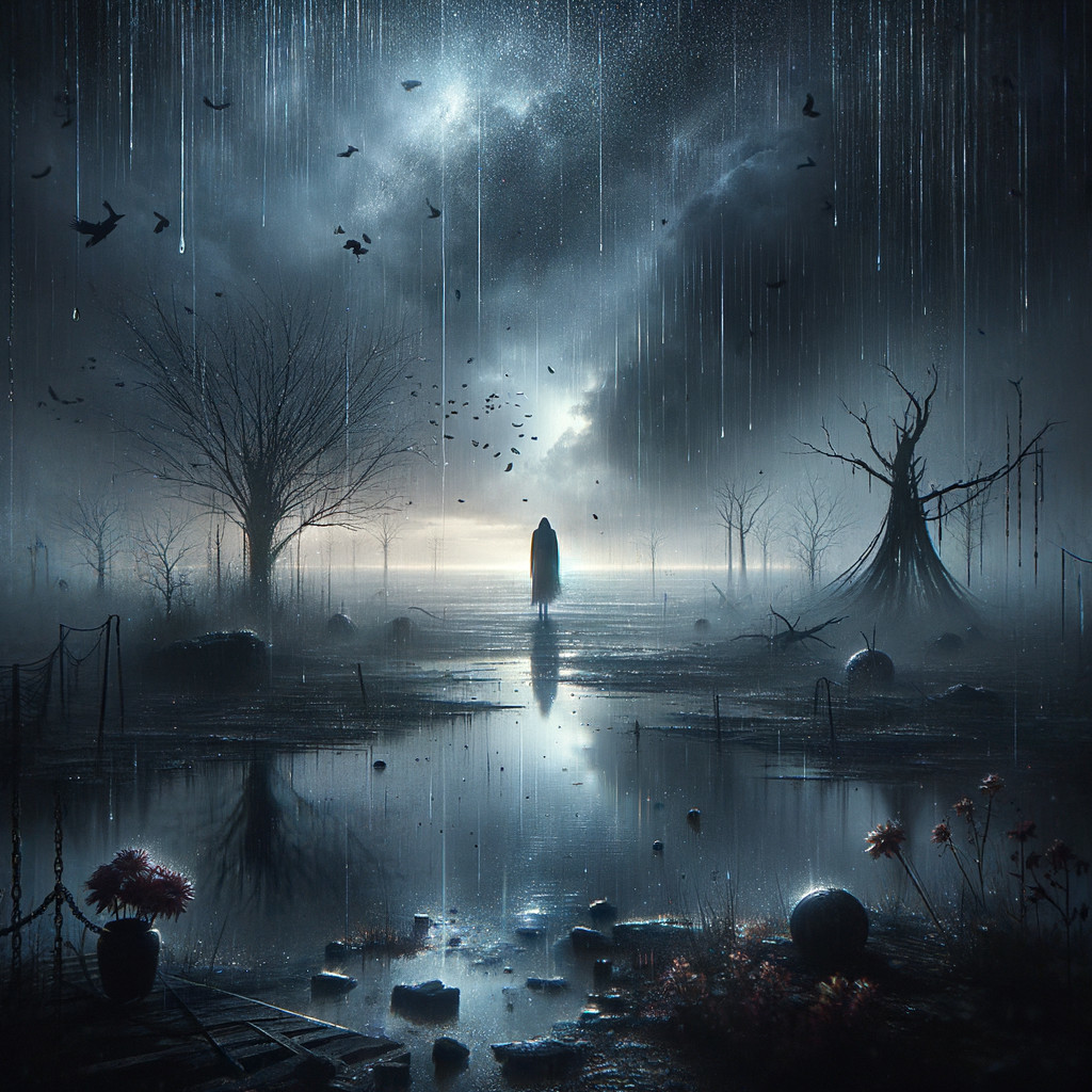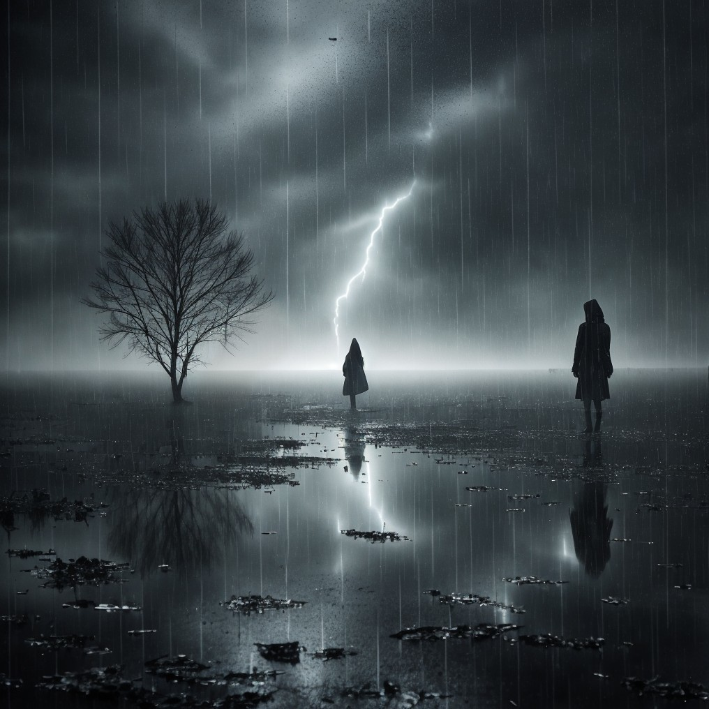 Two silhouetted figures stand apart on a reflective surface during a stormy night, with a lightning bolt illuminating the dark scene.