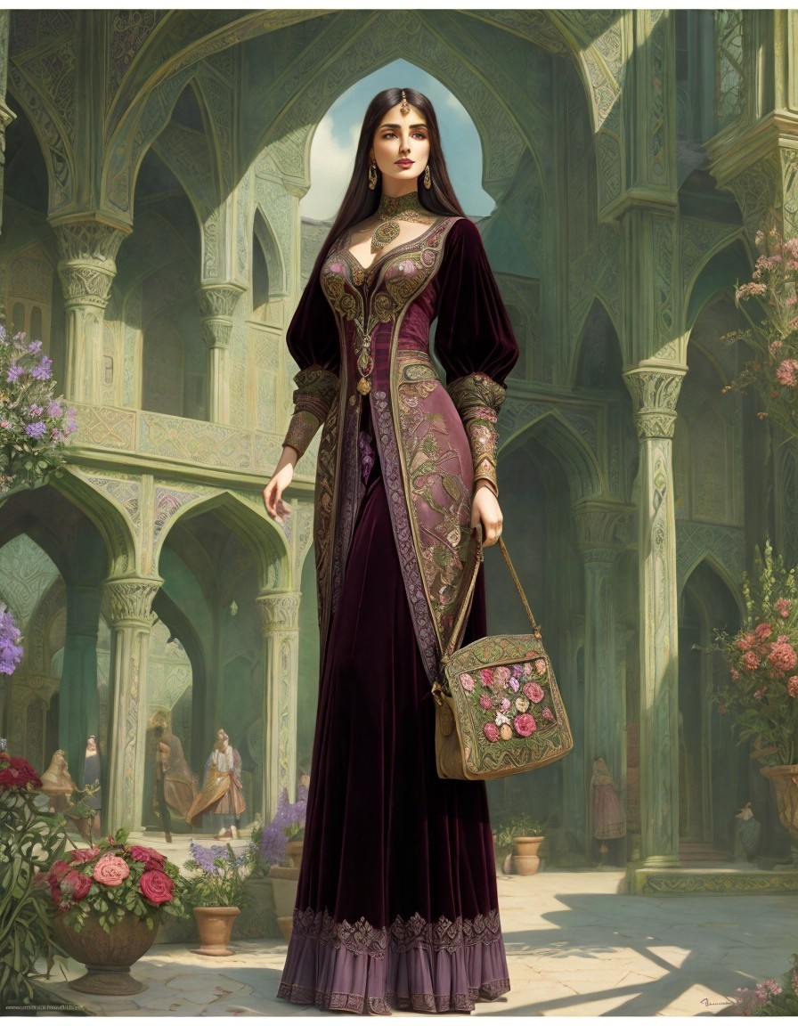 Beautiful woman in a beautiful courtyard. 3rd century Persian miniature art, violet, brown green, Ruby red, Velvet Black, Shabby, Dull Gold, Amber Gray, Golden Ratio, Surreal Fantasy, Elegant, High Definition Ultra Fine 3D Line, Zenangle Style, Watercolor Patchwork , Arthur Rackham Style, Paul Kidby, , Jacek yerka, Extremely Detailed, Intricate, Thoughtful, HDR, Fractal, Beautiful, Award Winning, Fantasy Look, Fantasy, Crisp Quality