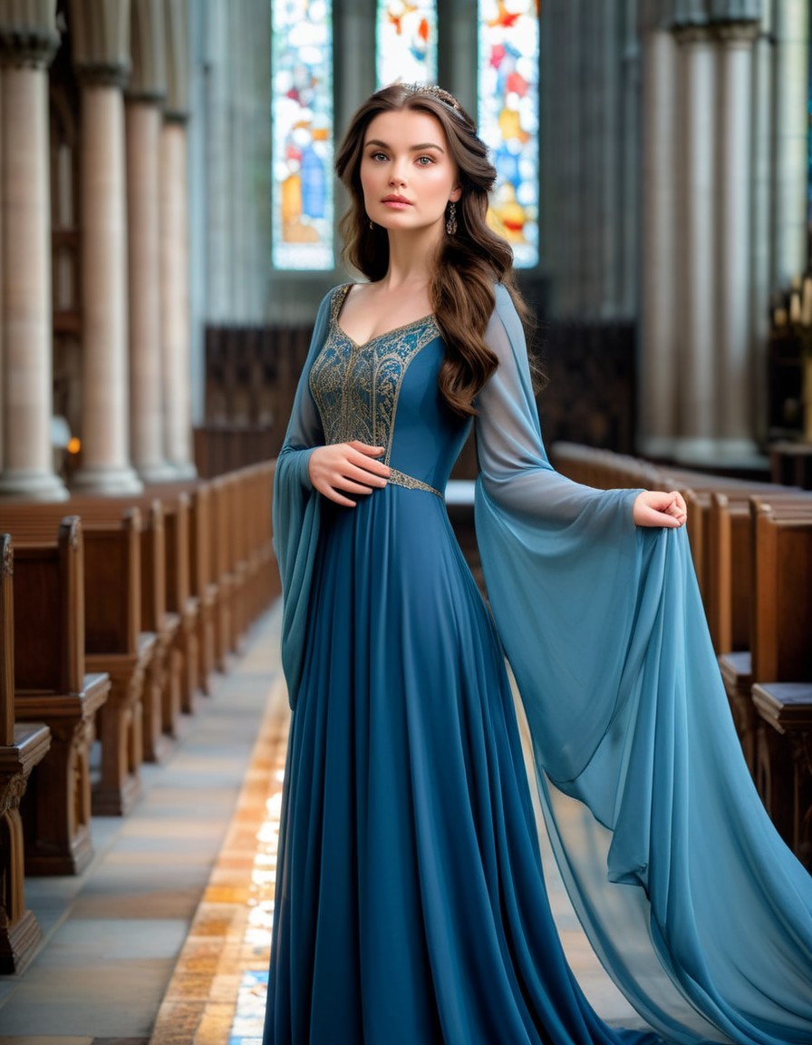 A serene bride stands in a cathedral, adorned in a blue and cream gown with intricate designs. She holds a bouquet of white roses, with sunlight streaming through stained glass windows behind her.