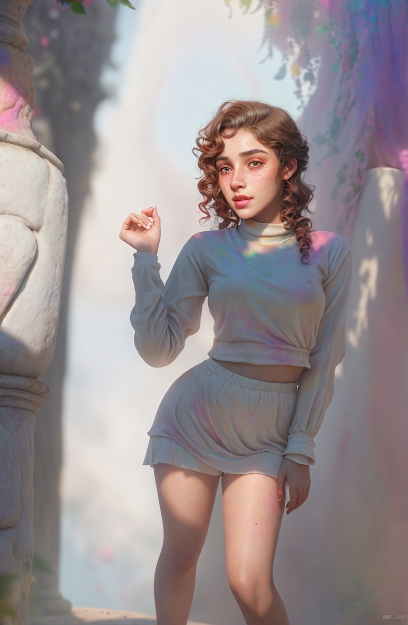 Girl in late teens, holi festival colors, curly hair, snub nose, full lips, freckles.
