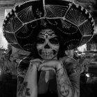 A woman with vibrant Day of the Dead makeup poses with a striking hat. Her artistic face paint features intricate designs, while she gazes intently from a rustic vehicle backdrop.
