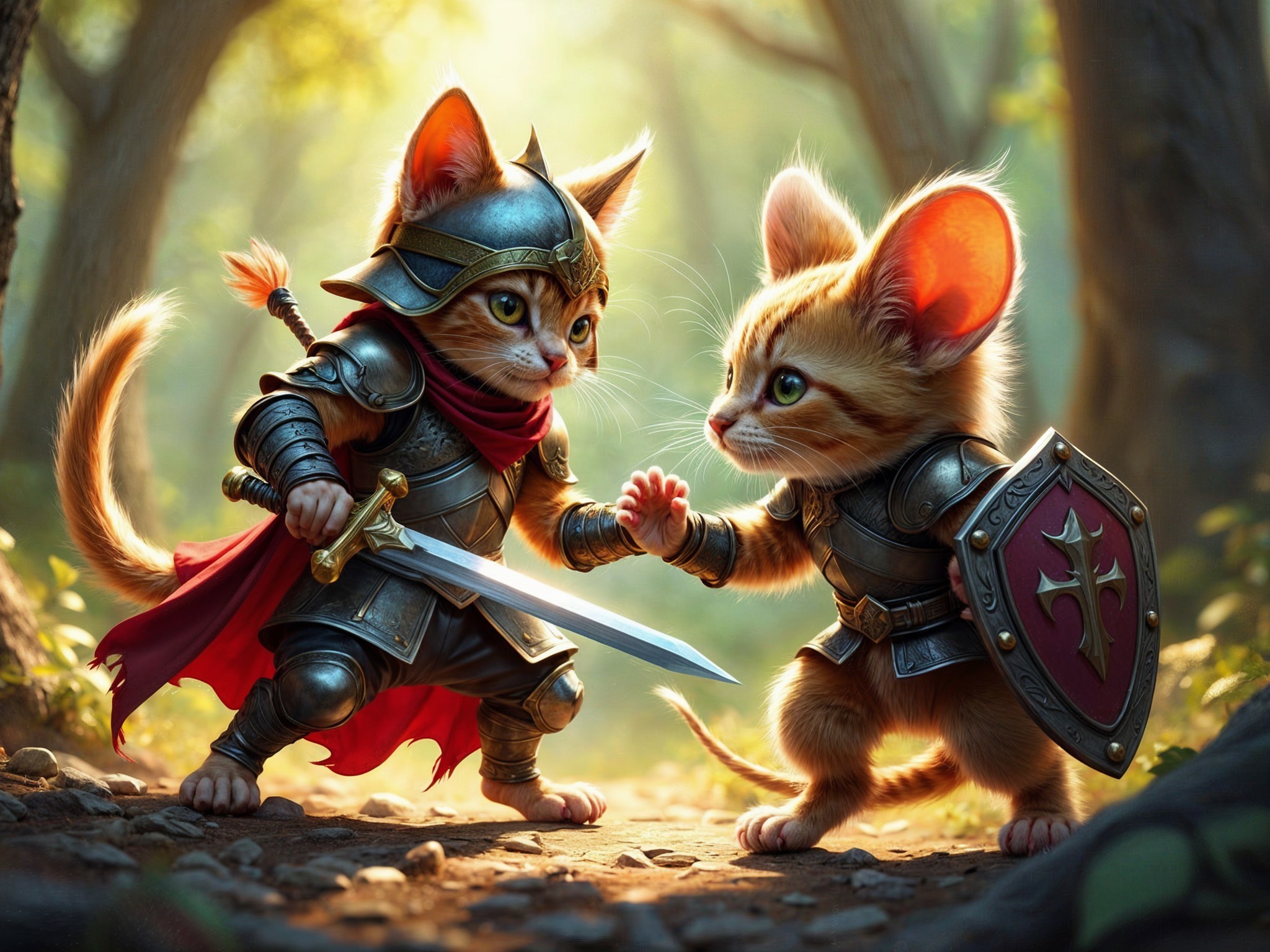 Fierce kitten warrior fighting on swords with a brave mousekin warrior, intricate battle armor, determined expression, sharp claws, intense eyes, tiny helmet with plume, miniature sword, shield with emblem, paw raised in readiness, fantasy setting, mystical forest background, dappled sunlight filtering through trees, vibrant color palette of gold, silver, and crimson, dramatic lighting casting shadows, detailed fur texture, digital illustration, dynamic pose