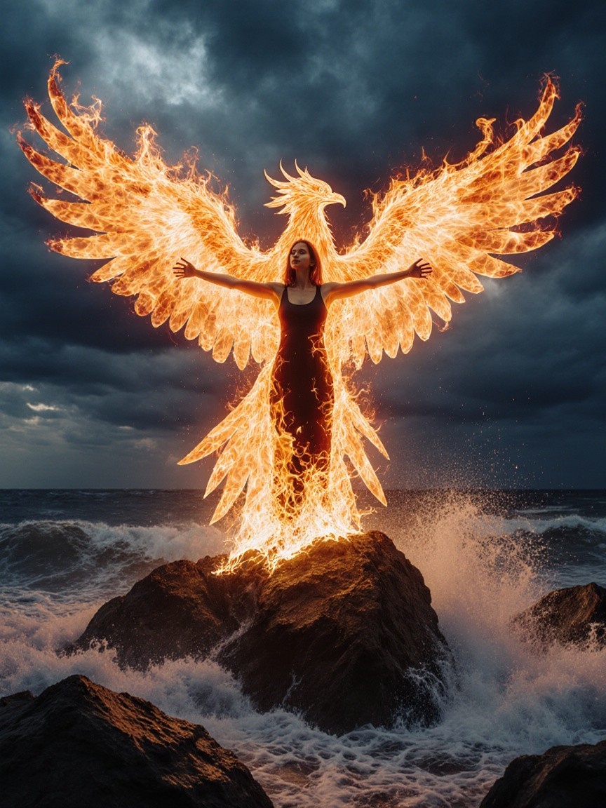 Prompt: A woman, standing engulfed in vibrant flames, her arms outstretched, transformed into a magnificent phoenix, its wings ablaze with fiery energy, soaring above crashing ocean waves and jagged rocks under a stormy sky, photorealistic, dramatic lighting, warm orange and cool blue color scheme, evoking power and transformation, medium shot, HDR, 8K, professional photography.