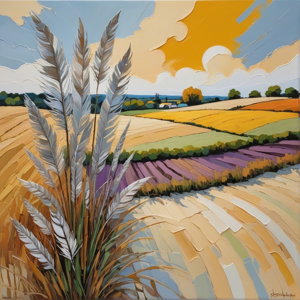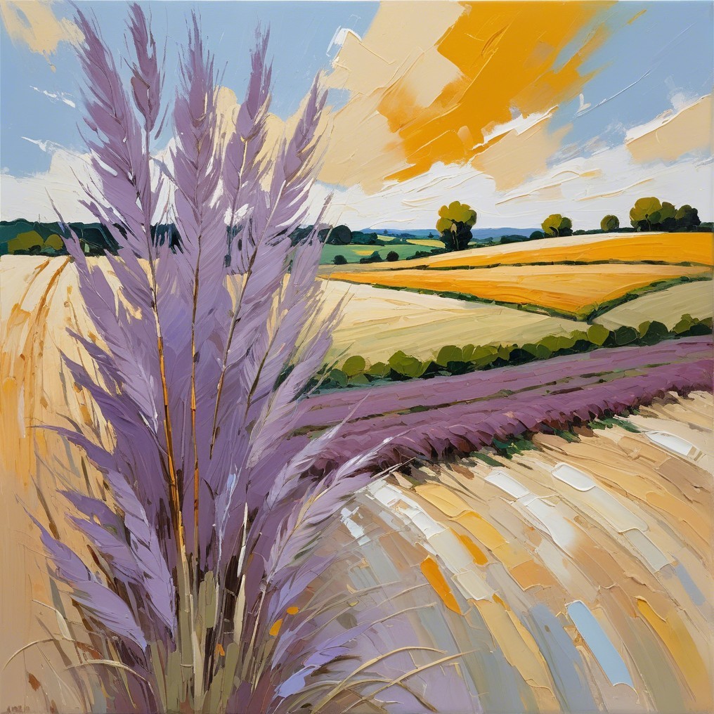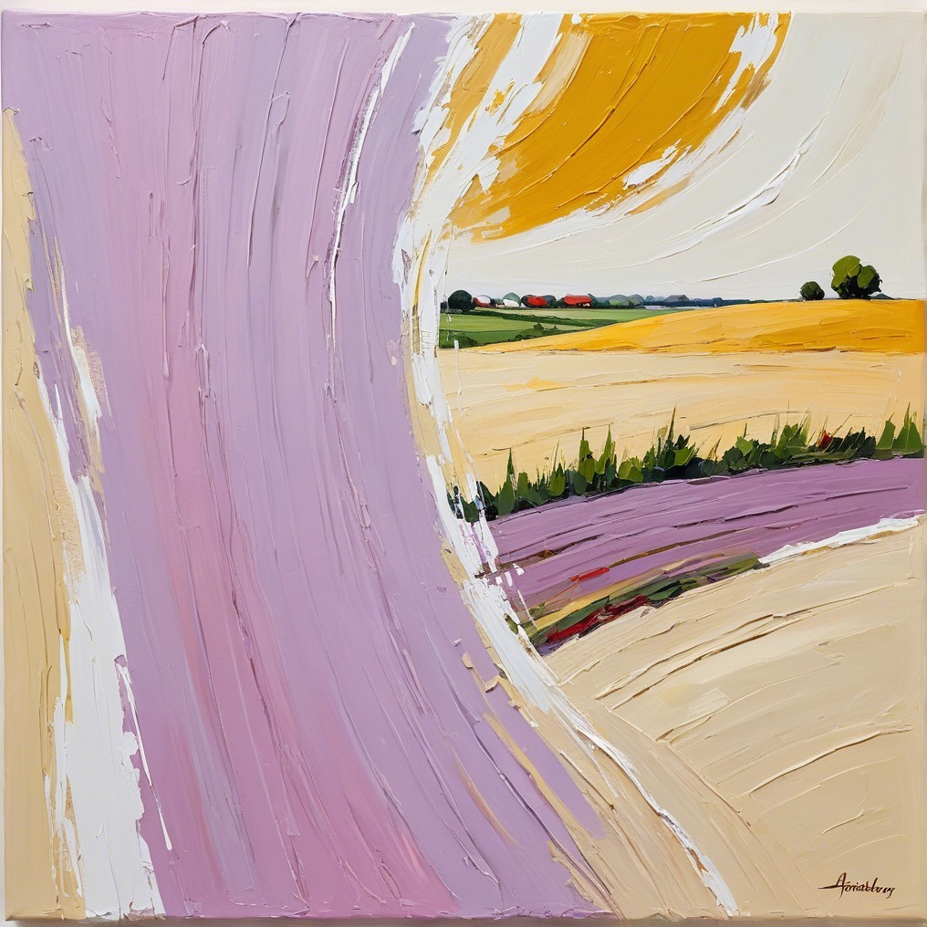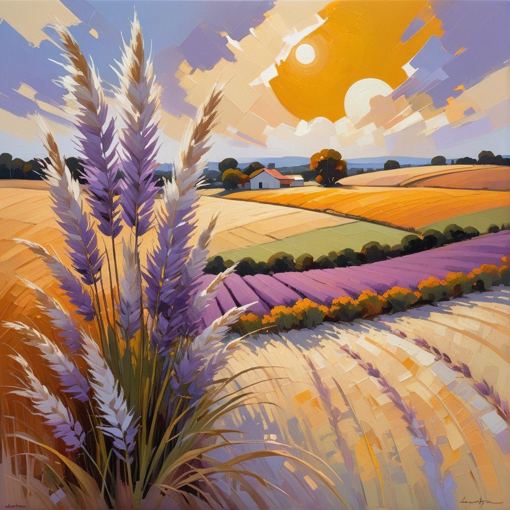 A vibrant landscape featuring rolling fields of golden wheat and purple flowers under a swirling sky. Simple white houses and cypress trees dot the horizon, illuminated by a bright sun.