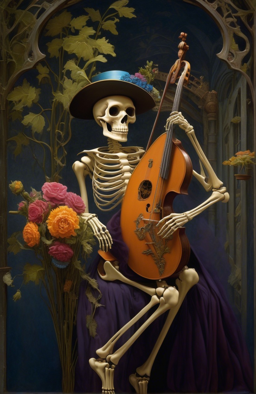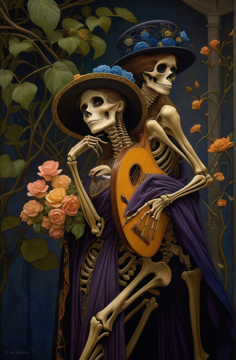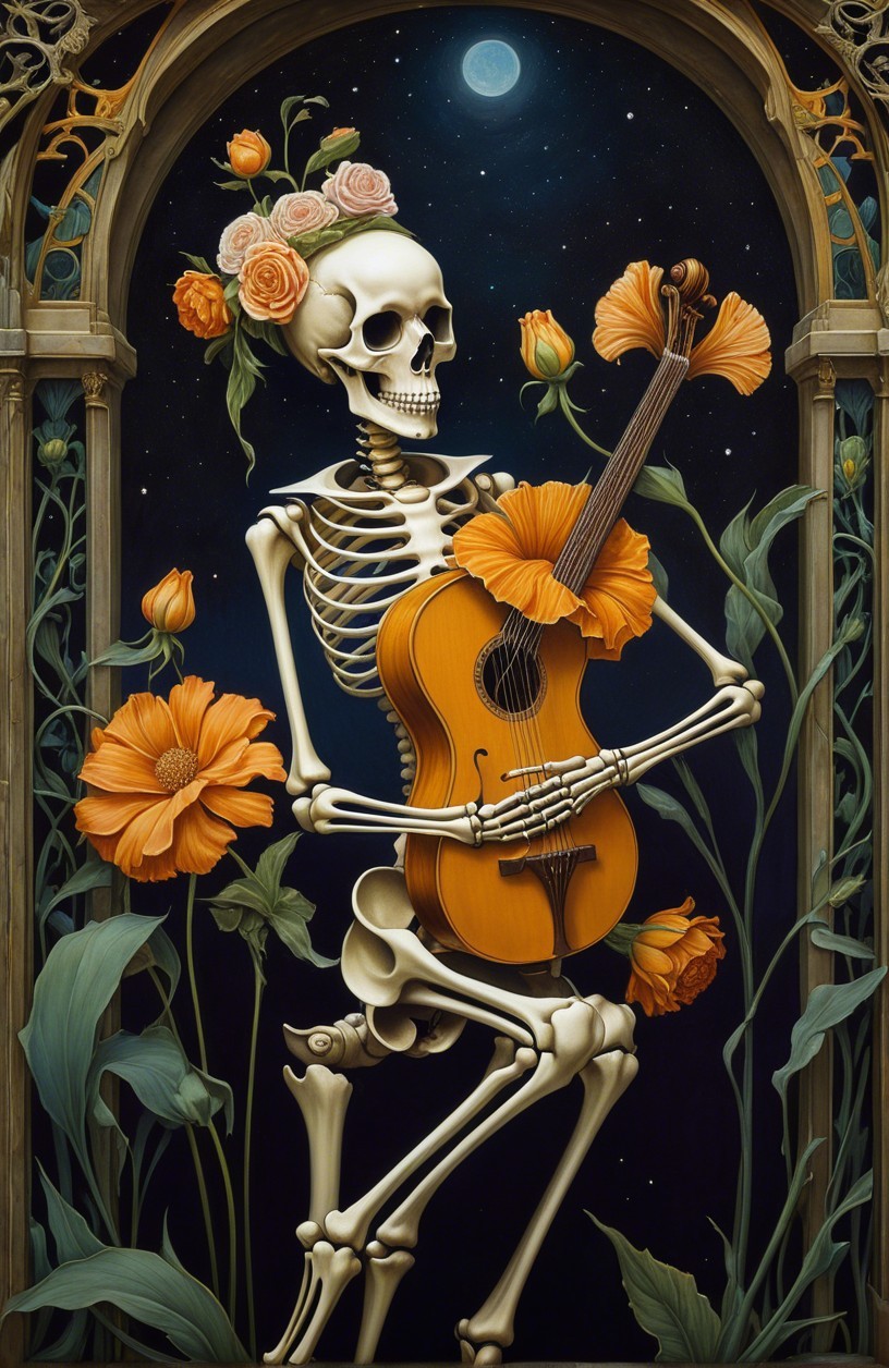A whimsical skeleton sits at a table adorned with orange roses, holding a plate of food. A small bird nearby adds a touch of nature to the enchanting, moonlit backdrop filled with trees.