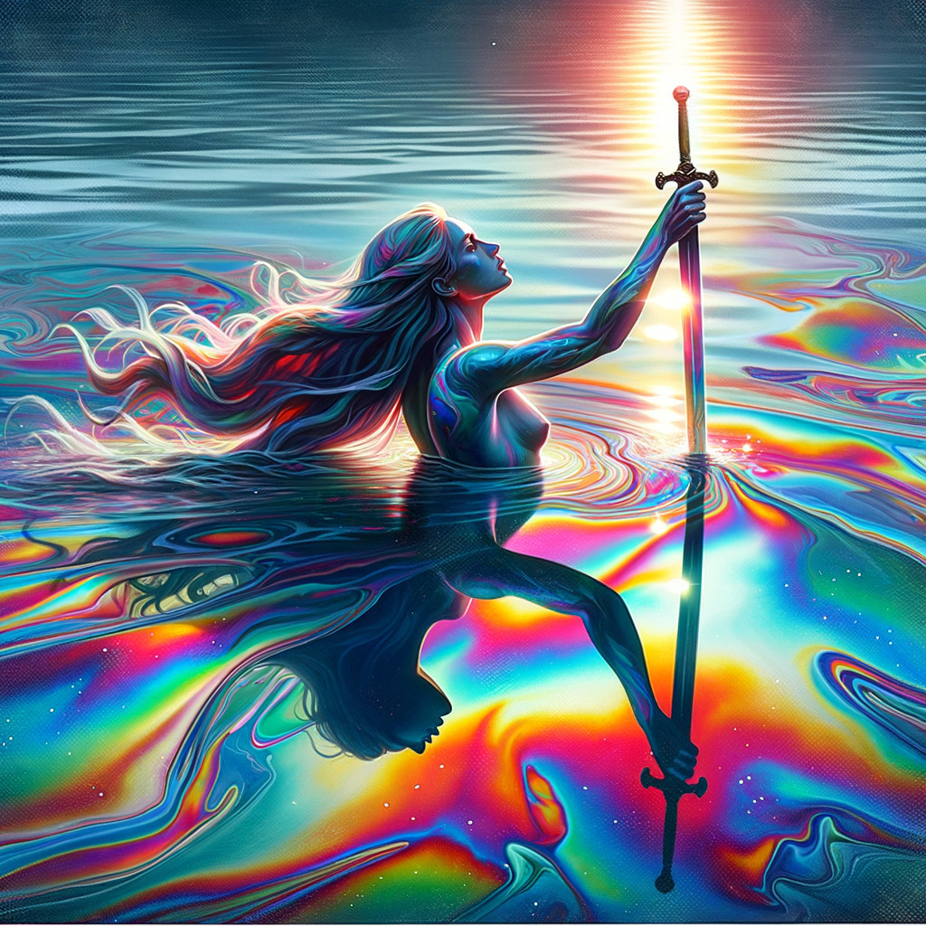 A vibrant illustration of a woman with flowing hair holding a sword aloft, standing in iridescent water under a blue sky.