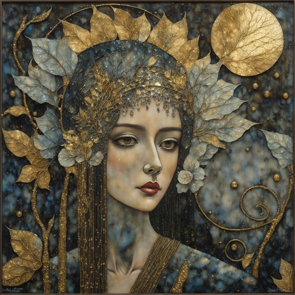 A serene woman with intricate features gazes forward, adorned with golden leaves and blossoms on her head. A luminous moon and dark blue background add an ethereal quality to the artwork.