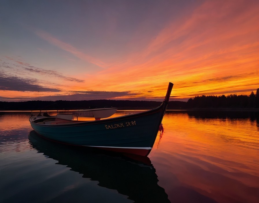 A boat on calm water with a vibrant sunset sky reflecting on the surface, creating a tranquil scene.