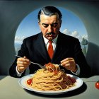 Prompt: "Eating spaghetti - René Magritte; Ethereal morning light, melancholic expression, intricate facial details, subtle tears, surreal micro details, abstract composition, dreamlike atmosphere, Miro-inspired style, Dali-esque elements, emotional depth, vibrant color palette, surrealistic touches, masterful brushwork, evocative shadows, introspective mood, fine art painting, intricate patterns, unique perspective, by a skilled artist, Artstation."