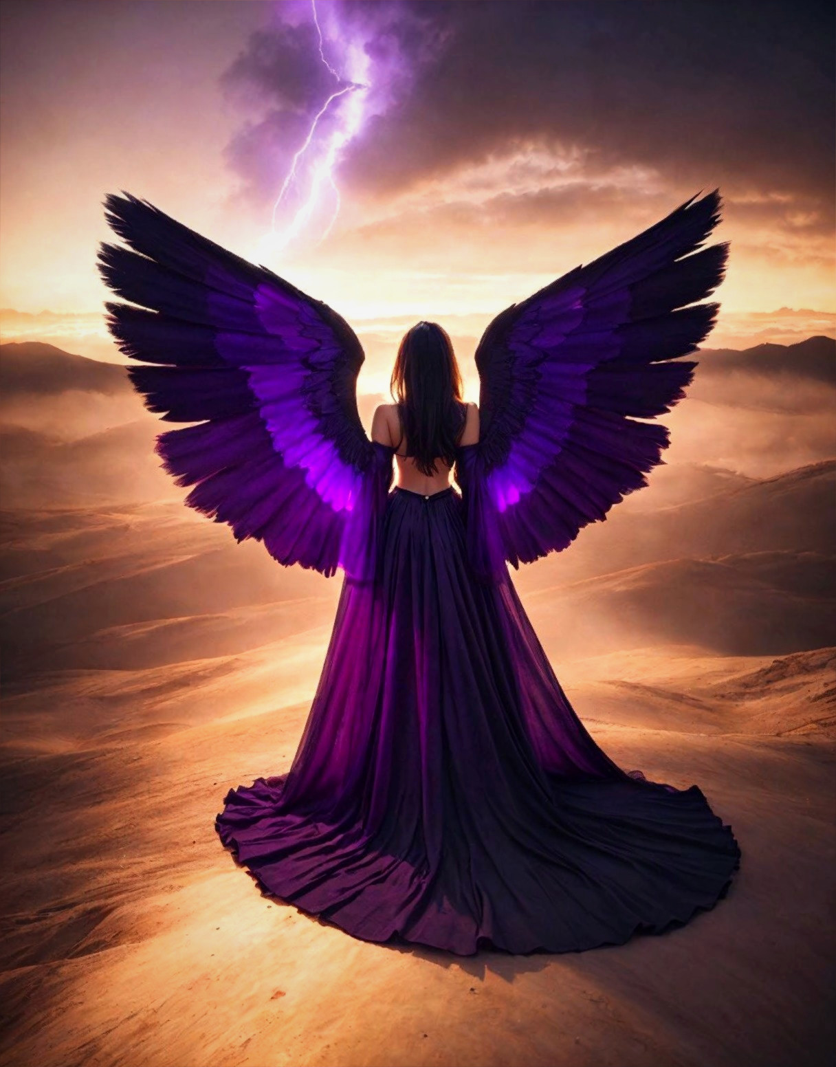 A figure stands against a dramatic sky, adorned with large, dark purple wings. The landscape glows eerily as a bolt of lightning strikes, creating a mystical and powerful atmosphere.