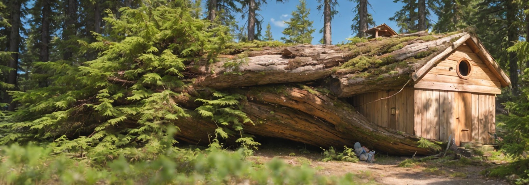 Enchanting forest scene with a moss-covered fairy-tale cottage, surrounded by towering trees and various mushrooms under a soft, dappled light.