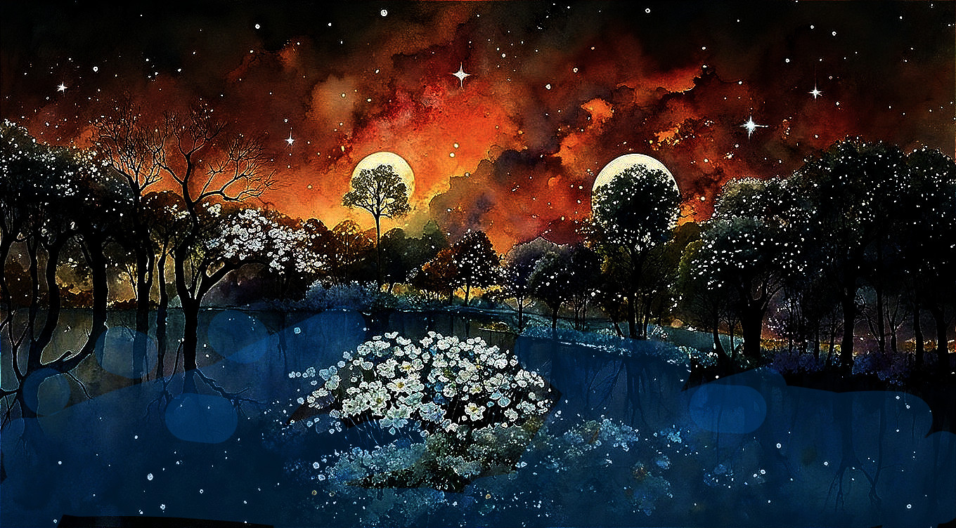 A tranquil landscape at twilight features a serene lake reflecting vibrant colors of a cosmic sky. Silhouetted trees and blooming flowers add beauty to the enchanting scene.