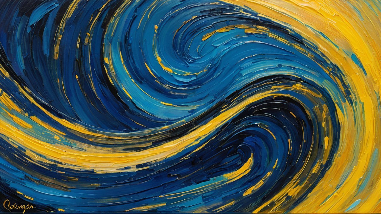 An intensely textured, close-up impasto oil painting in the style of Vincent van Gogh. The image shows a dynamic swirl of thick, expressive brushstrokes in various shades of deep blues and vivid yellows. The brushstrokes are thick and raised, creating a visible texture with peaks and valleys of paint that