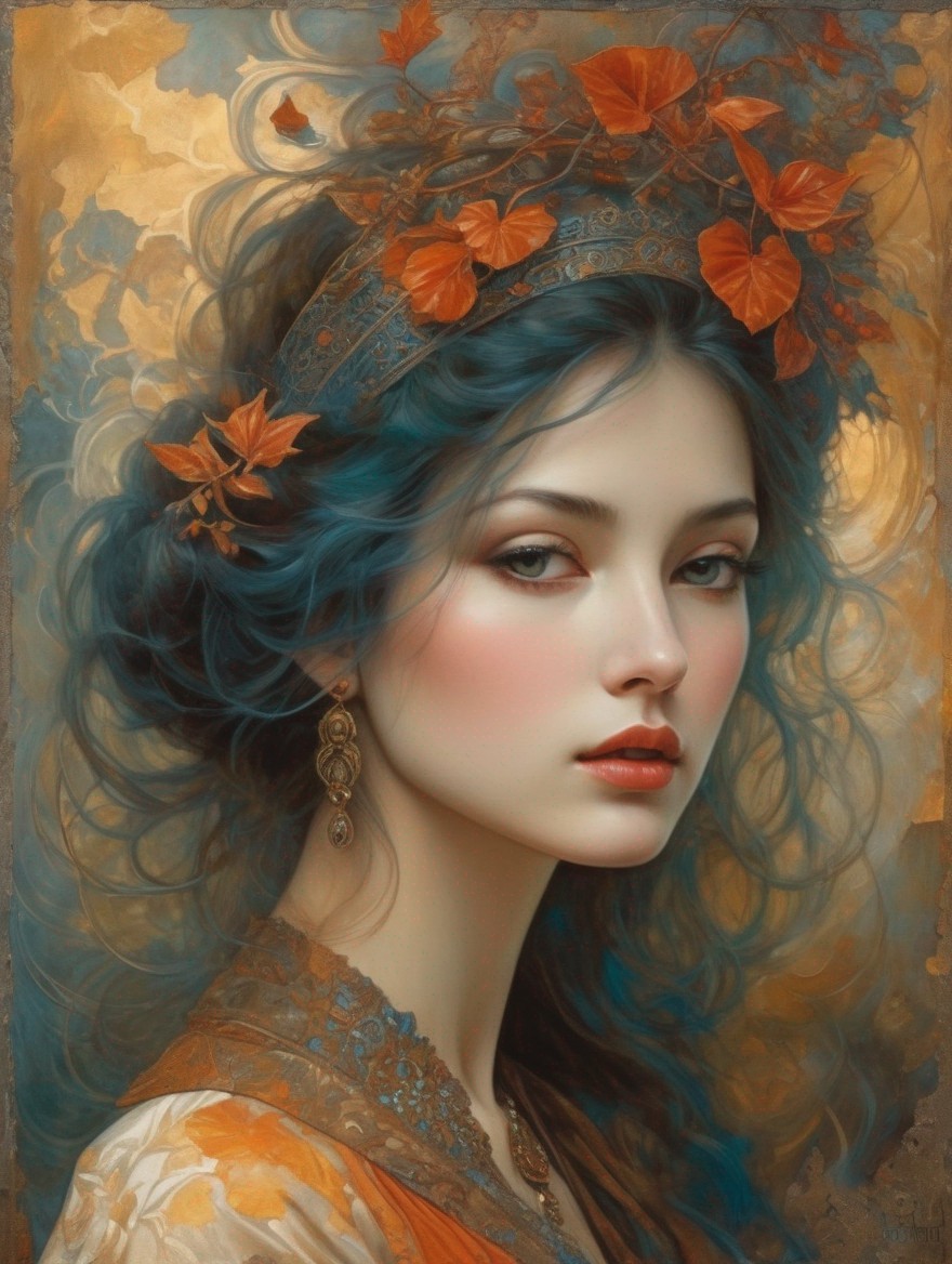 An elegant woman with a decorative headpiece and autumn leaves in her hair, with a serene expression and intricate background.