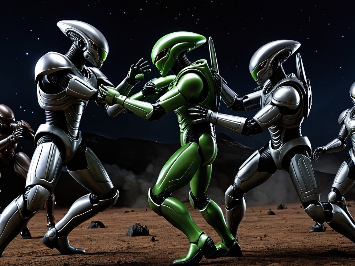 A dramatic scene depicts metallic humanoid robots grappling with a vibrant green figure, set against a dark, smoky backdrop resembling an alien landscape. Tension and dynamic poses abound.