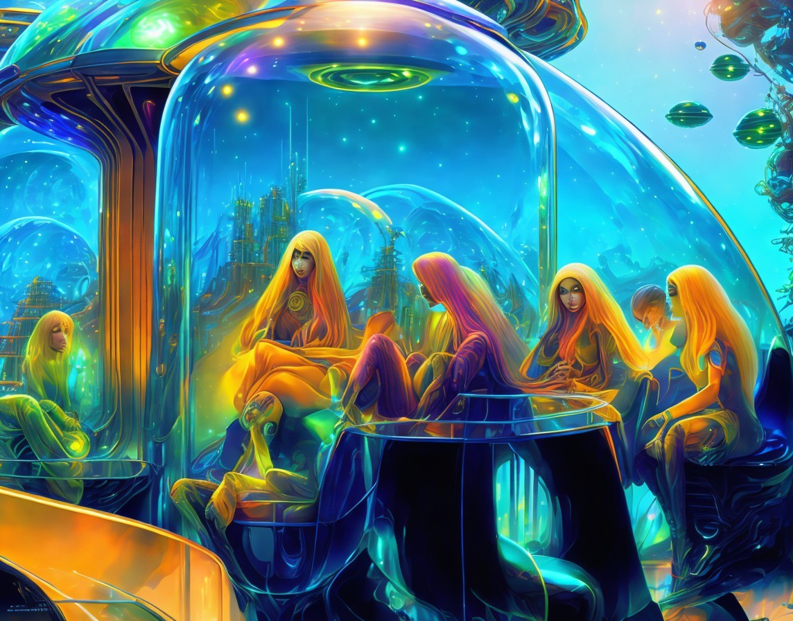 Comic. Very unhappy aliens are sitting in their glass spaceship and don't want to get out, they are homesick!! Crying extraterrestrial beings, futuristic spaceship standing at a lake of our earth, sad expressions, detailed illustration, sci-fi style, bright colors, emotional atmosphere, inspired by H.R. Giger