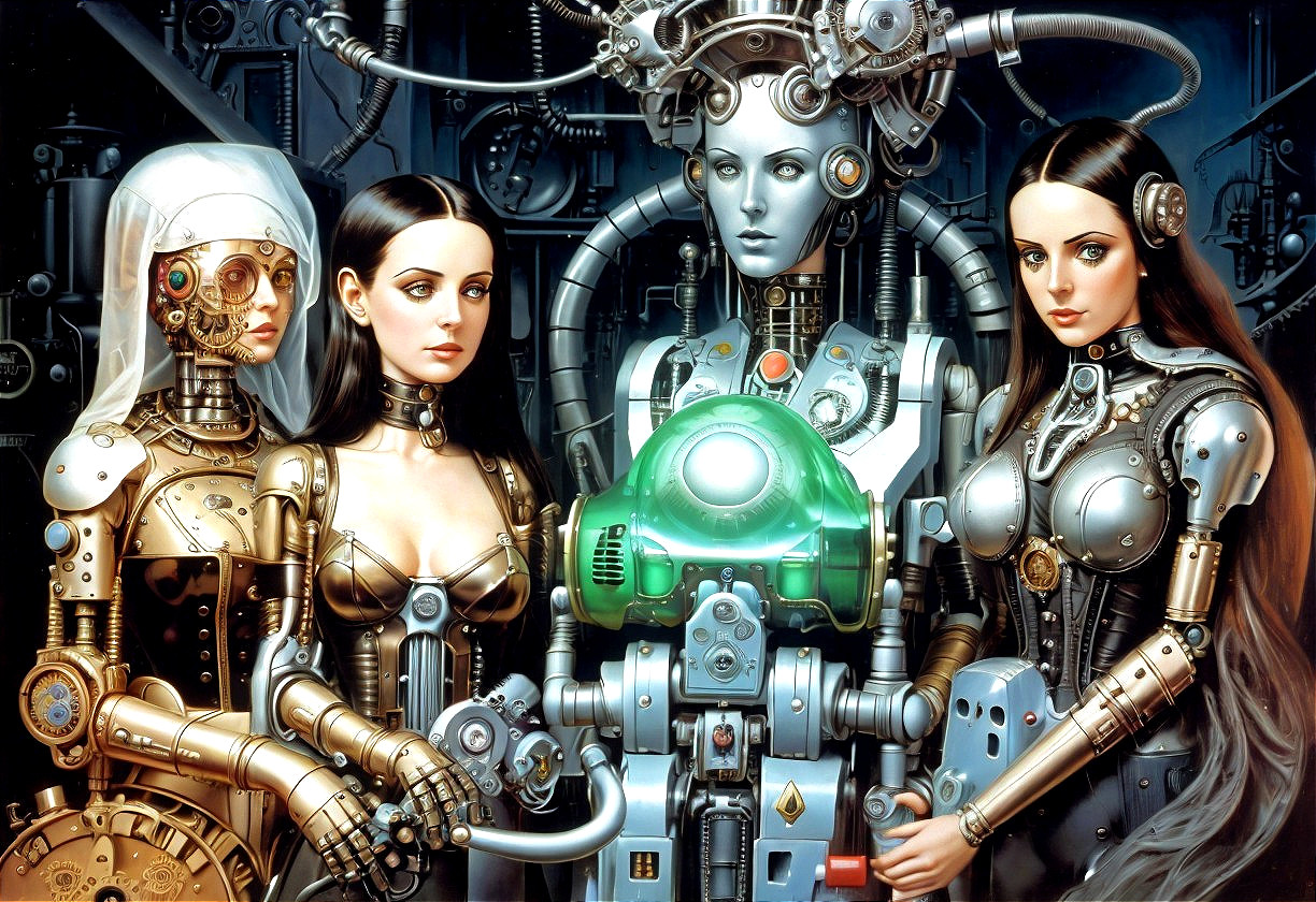 Four female figures with cybernetic features against a mechanical backdrop; two appear human-like, two are robots.