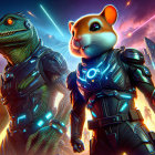 A group of futuristic hamsters in armor wielding blaster guns, ready for battle amidst a fiery, dramatic landscape filled with towering structures and a smoky sky.