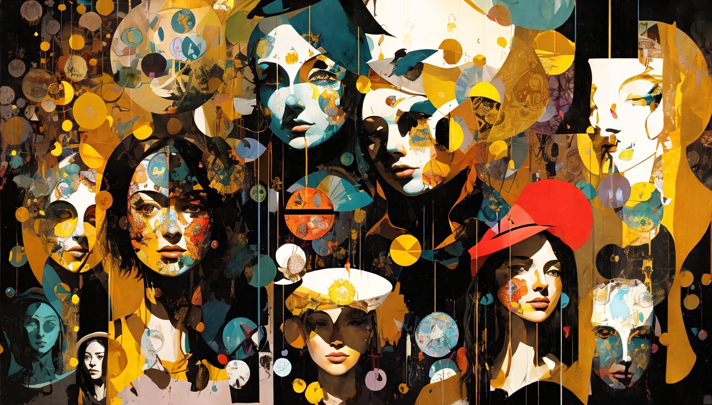 + Prompt:stunning art design by Dave McKean, Mike Mignola and Bill Sienkiewicz. Surreal collage with a woman standing in the center wearing a yellow dress and a wide-brimmed hat, surrounded by floating disembodied heads with exaggerated, distorted facial expressions and multiple arms. The background is a deep teal with scattered floating objects like clocks, photos, and old letters, evoking a chaotic dream-like atmosphere.