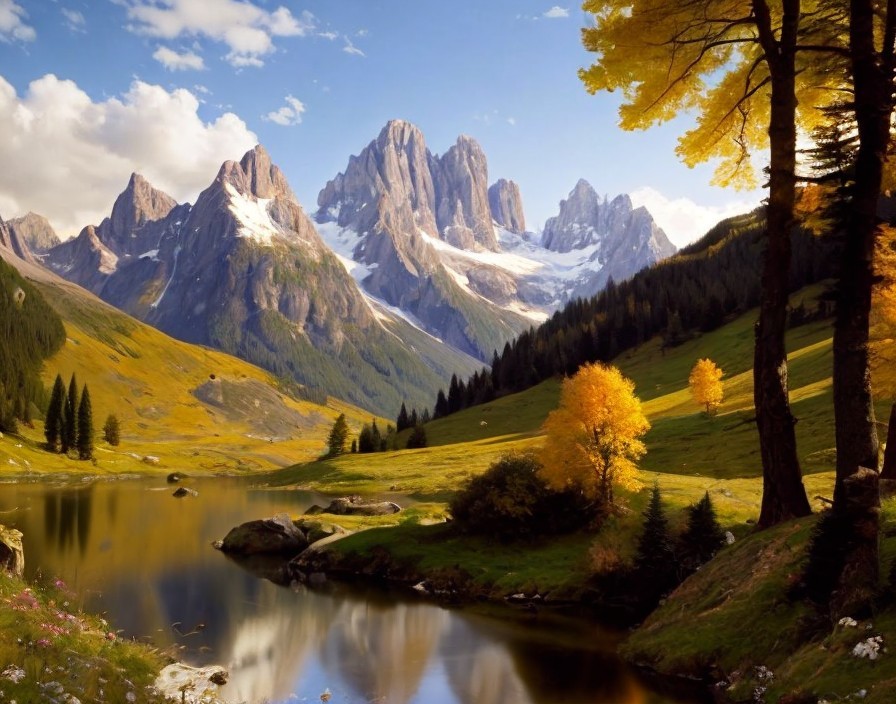 Autumn Landscape with Lake and Snow-Capped Mountains