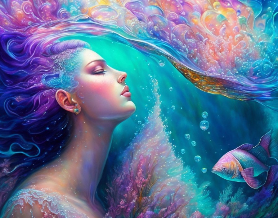 Surreal underwater artwork with woman, flowing hair, vibrant marine life