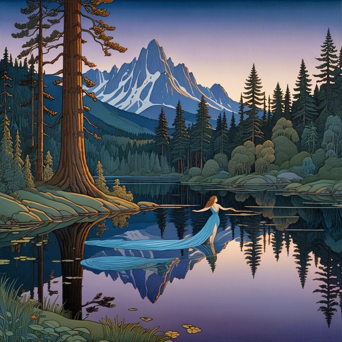 A serene landscape features a woman in a flowing blue dress standing by a tranquil lake, reflecting mountains and trees under a starry sky, with a crescent moon illuminating the scene.