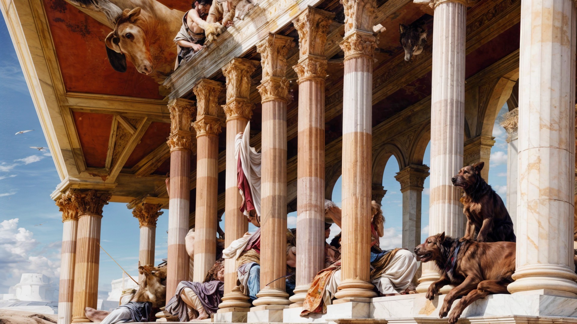 A group of ancient figures in elaborate robes sits on a marble terrace adorned with grand columns. They appear engaged in conversation, with a small dog resting nearby under a clear blue sky. Note: this is based on a painting by Tiepolo.