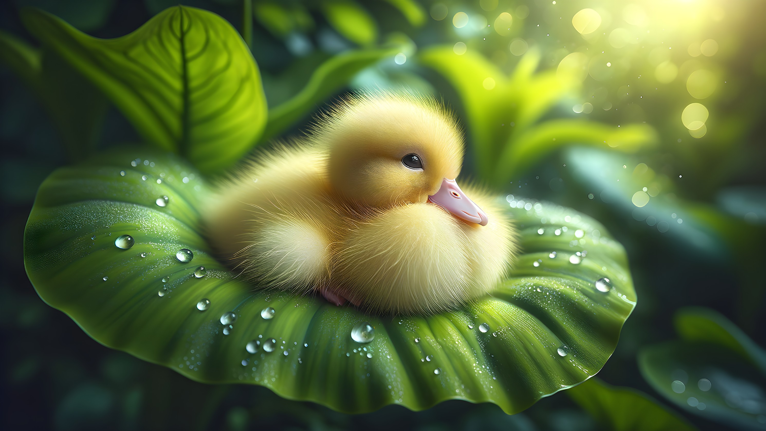 A fluffy yellow duckling sleeps peacefully on a large green leaf, surrounded by glistening water droplets. Its soft feathers and gentle features create a serene, tranquil scene in nature.