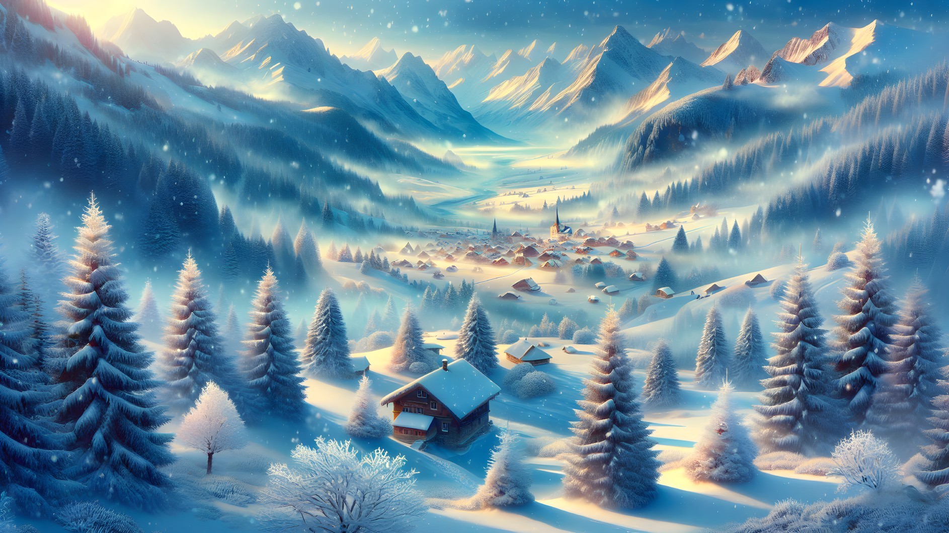 A serene winter landscape features snow-covered mountains and a quaint village nestled in a valley. Pine trees blanket the scene, creating a magical, tranquil atmosphere under a soft snowfall.